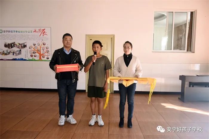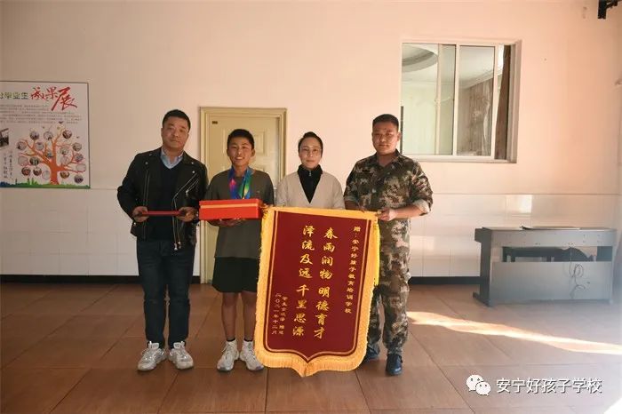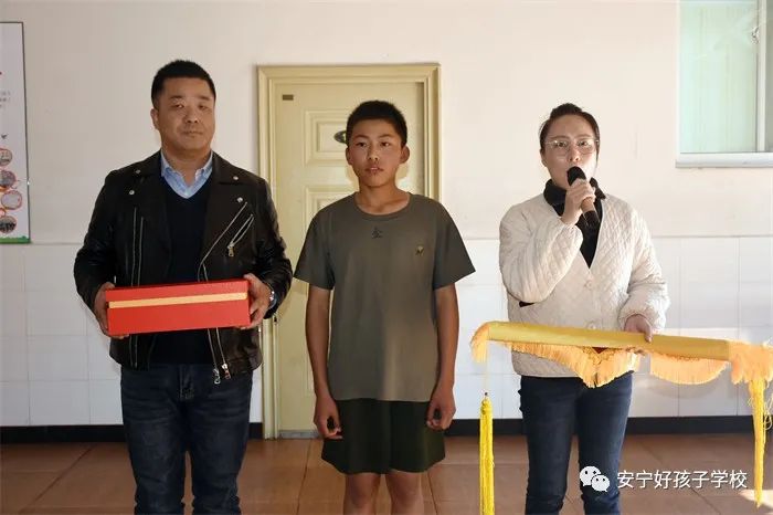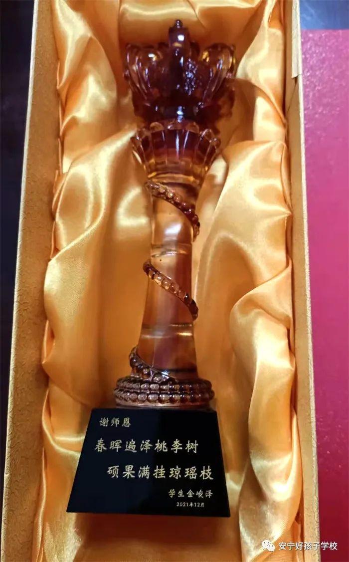 潤物無聲,感恩有聲。為表達謝意,金峻澤的父母將一面繡有“春雨潤物 明德育才,澤流及遠 千里思源”字樣的錦旗贈給學校,將一個印有“春暉遍澤桃李樹,碩果掛滿瓊瑤枝”的獎杯贈給孩子的班主任瞿老師,以此感謝學校、老師對孩子的諄諄教誨和無微不至的關懷,學校副校長楊玉峰代表學校接下了這面沉甸甸的錦旗。這面錦旗和這個獎杯,飽含著家長的真摯情感,也蘊藏著老師們愛的情懷。