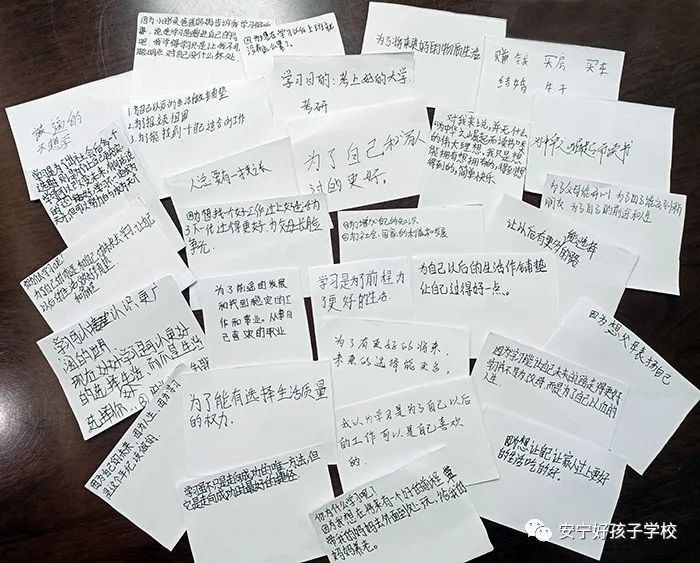 課程伊始,張老師首先通過“你為什么學習?”這一簡單提問,單刀直入、切入主題,孩子們若有所思,爭相發(fā)言。隨后張老師又和孩子們進行互動,要求孩子們在收到的小紙片上以匿名的方式寫下自己的想法。孩子們在紙片上暢所欲言,有的回答簡單直白,有的充滿童趣,有的誠懇務實。張老師挑選了部分答案進行分享,課堂氛圍活躍了起來,孩子們熱情高漲。