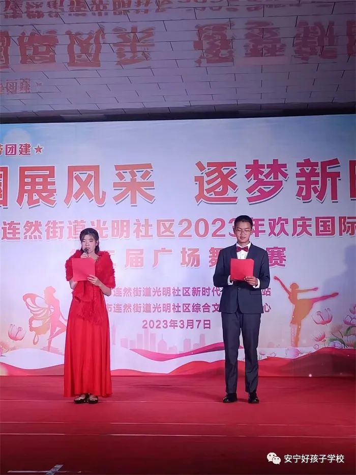 2023年3月7日晚,我校組織部分學(xué)生參加了安寧市連然街道光明社區(qū)舉辦的“巾幗展風(fēng)采 逐夢(mèng)新時(shí)代”2023年歡慶國(guó)際婦女節(jié)暨第二屆廣場(chǎng)舞大賽活動(dòng);顒(dòng)在我校兩名小主持人熱情洋溢的介紹和觀眾們熱烈的掌聲中拉開(kāi)帷幕。